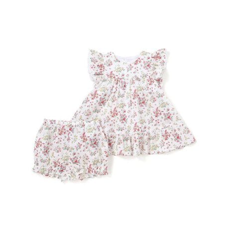 明るい小花柄のリバティプリントが赤ちゃんのお顔を華やかに引き立て、袖や裾にあしらわれたフリルが可愛らしさを添えるワンピースとブルマのセット。