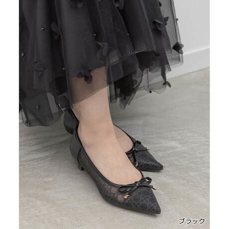繊細なグリッターラインがきらめくローヒールパンプス。