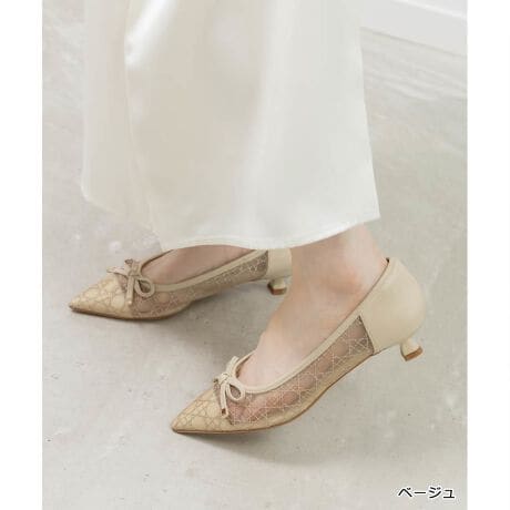 繊細なグリッターラインがきらめくローヒールパンプス。