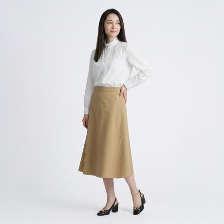 ハリのある肉厚なコットンチノ素材で仕立てた、フレアシルエットのスカートです。落ち着きのある膝下丈のスカートは、大人の女性におすすめ。コーディネート力に優れた、ベーシックなカラーがラインナップしています。プリントやチェック柄のトップス・アクセサリーともコーディネートをお楽しみいただけます。