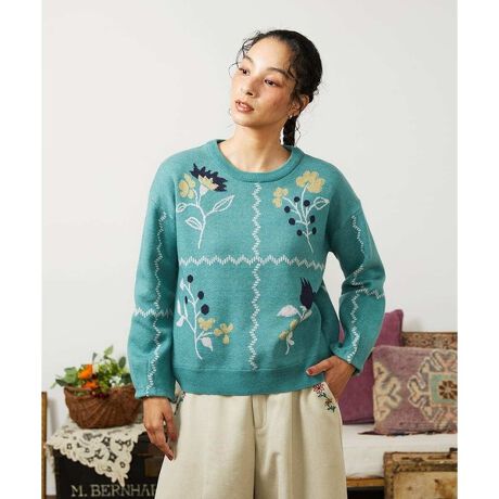 大きなお花柄が目を惹くニットプルオーバー。ドロップショルダーのゆったりとしたシルエットがリラクシーな着用感を叶えます。お花とジグザグラインを組み合わせた柄をジャカードで編みたてました。後ろ面にも同様に柄を入れ込み、お袖にもラインをプラス。どの角度から見ても抜かりないかわいさのニットは、褒められ間違いなしのイチオシのひと品です。