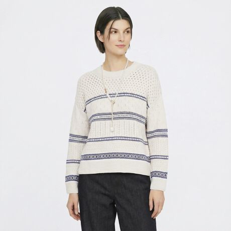 [型番:72262180231]伝統とエレガンスを感じさせるフェアアイル柄でスタイリングの主役になるニットプルオーバー。ケーブル編みやレース編みなど、様々な編み模様を組み合わせた手の込んだつくりが他にはない魅力を発揮します。お手持ちのシンプルなボトムとコーディネートするだけで、美意識の高いコーディネートが完成します。※商品画像はサンプルを使用しているため、実際の商品と色味などの仕様が異なる場合がございます。予めご了承ください。model:T.167着用サイズ:38