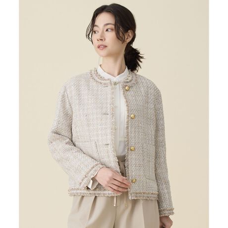 きれいめカラーで華やかなファンシーノットツイードジャケット■デザイン昨年ご好評いただいたGIOLICAツイードをアップデートしたノーカラージャケットです。カーディガンを羽織るようなリラックス感のあるボクシーシルエットはそのままに、裄丈を少し短く調整しています。さらに肩周りや袖を柔らかく仕上げ、かしこまりすぎない印象にしています。襟ぐり、裾、前開き、袖口にはフリンジを挟み込みアクセントにしています。前見返しには別布のグログラン生地を使用し、軽やかでスッキリとした仕様に仕上げました。フリンジもテープ状に改良し、より華やかなディテールになっています。ラグジュアリーなコーディネートからカジュアルまで幅広く活躍してくれます。■素材ベージュは、多種類のファンシーヤーンを使用しながらも、見た目以上に軽く通気性の良い素材に仕上げています。ベースにほどよい表情を持たせ、オリジナルのラメ入りリボン糸で繊細な華やかさをさりげなくプラスしています。さらに、明るめの多色ノットを加えることで、全体の印象を明るく華やかにし、エレガントな雰囲気に仕上げています。軽さを保つために、変形メッシュ(プロペラ)組織を採用し、目付を調整しています。ブルーも同様に、多種類のファンシーヤーンを使用し、見た目以上に軽く通気性の良い素材に仕上げています。スラブ杢の表情をベースに、オリジナルのラメ入りリボン糸で繊細な華やかさをプラスしています。控えめな多色ノットを加えることで、全体の印象を上品に引き立てています。軽さを保つため、こちらも変形メッシュ(プロペラ)組織を採用し、目付を調整しています。■同素材ジレ(VRWRLS0203)