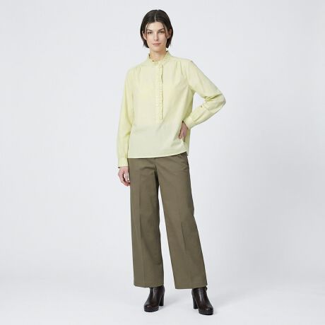 滑らかな質感のファインコットン素材を採用したロングスリーブプルオーバーブラウス。襟元にあしらったフリルのディテールが、顔周りにフェミニンな雰囲気をプラスします。背中にも細かいギャザーをあしらいました。ご自宅で手洗いが可能なウォッシャブル仕様で、いつでも清潔感をキープできるのも魅力です。