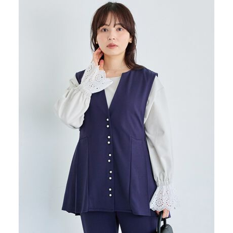 キーネックとパールボタンが、上品で洗練された印象を与えます。後ろのタックが動きに合わせて揺れ、女性らしさを演出。