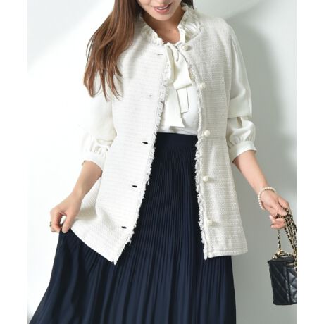 パール釦が目を惹き、上品にスタイルを演出してくれるツィード素材を使用したトレンド感のあるジレです。合わせやすいノーカラーなので幅広いスタイリングに決まり、ハイウエストの切替がスタイルアップ効果も◎また軽さのある仕立てが気負わないこなれたカジュアルコーデに決まり、フリンジディテールが程よい抜け感を演出。