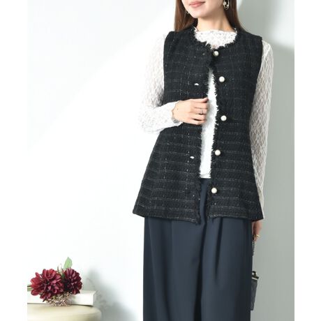 パール釦が目を惹き、上品にスタイルを演出してくれるツィード素材を使用したトレンド感のあるジレです。合わせやすいノーカラーなので幅広いスタイリングに決まり、ハイウエストの切替がスタイルアップ効果も◎また軽さのある仕立てが気負わないこなれたカジュアルコーデに決まり、フリンジディテールが程よい抜け感を演出。