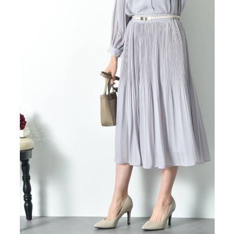 透け過ぎないシアー感と、裾に向かって広がる消しプリーツが上品な印象を演出してくれます。動きに合わせて揺れるしなやかさがフェミニンな印象に決まり、体のラインを拾わないサイジングと丈で美脚効果は抜群です。ウエストはゴム仕様になっていて締め付けのストレスも少なく、華やかさと動きやすさのある1枚です。