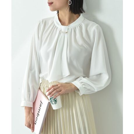 マットな表面感が上品な雰囲気に演出しくれ、肌触りの良いモスクレープ素材を使用しました。きちんと感満載のフリルタイにパールメタルバーをあしらいました。ネックレスなどアクセサリーが無くても顔回りを華やかに演出してくれます。パールバーは取り外し可能で、コーディネートに合わせたアレンジが可能です。またフリルタイはネックより内側に入れてすっきりした着回しも◎