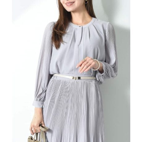 素材はシワになりにくく肌触りの良いジョーゼット素材を使用。上品なクラシックイメージにスタイルが完成するブラウスです。袖口をクシュっとたくし上げるとプリーツがバルーン状になり、手元をフェミニンに演出してくれます。また胸元の釦を開ければスキッパーのすっきりした印象に◎