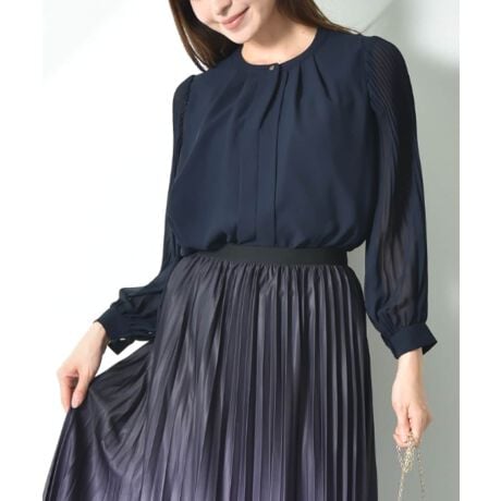 素材はシワになりにくく肌触りの良いジョーゼット素材を使用。上品なクラシックイメージにスタイルが完成するブラウスです。袖口をクシュっとたくし上げるとプリーツがバルーン状になり、手元をフェミニンに演出してくれます。また胸元の釦を開ければスキッパーのすっきりした印象に◎
