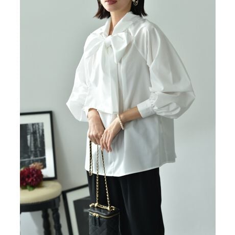 スタンド襟にBIGなリボンをデザインした印象的なブラウスです。長いリボンなので結んでリボン先を垂らしたり、前で結んでタイ風なアレンジも素敵です。また前後2WAYなのでその日にコーディネートによってアレンジも可能なのも嬉しいポイントです◎