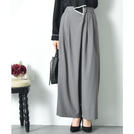 軽やかでストレッチ性に優れた生地は、心地よい感触と優れた快適性をお届けします。ごわつかず気になる腰回りもすっきり着回せます。ラップ風のデザインがこなれたスタイルに決まり、ひと味違ったきちんとスタイルに◎
