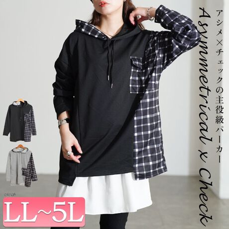 【大きいサイズ】 サイドチェック切替えアシンメトリーパーカー 大きいサイズ レディース トップス 冬
