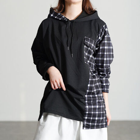 縦ラインのチェック切替えがアクセントになったデザインパーカー。程よいゆとりの身幅と長め丈がバランス良く大人カジュアルを楽しめる一枚。サイドチェック柄の切替えやアシメ裾が自然なラインを作り、スタイルを細見せ。フードにもチェック柄切替えが施されており、後ろ姿もこなれ感たっぷり。柔らかなスウェット生地で心地よく着れ、ルームウェアにもおすすめ。シンプル派さんにも取り入れやすい魅力的なパーカーは気分も明るくしてくれます。