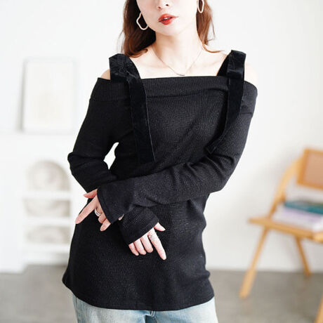愛らしく色っぽい、ベロアリボンオフショルラメリブニット。体型を拾わないから安心して着れる♪オーバーでもタイトでもない着回し抜群の綺麗めシンプルシルエット◎お顔まわりをスッキリ見せるオフショルダーとキュートなリボン肩紐で小顔効果抜群!視線が上に上がることでスタイルアップ効果も♪ワンツーコーデでも色っぽく見えるオフショル?ラメリブ素材で着映える華やかな一着☆