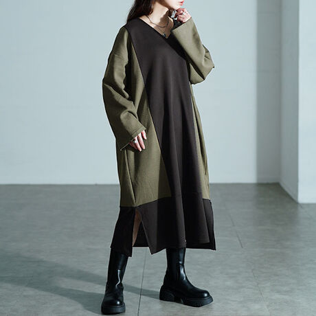 落ち着きのあるシックな色合いのコントラストが印象的な異素材ドッキングワンピース。程よいハリ感と艶感のある身頃部分と、リブ編みのサカリバニットソーをドッキングし、まるでワンピースにカーディガンを羽織っているかのようなデザインだから、一枚でサマ見えに。ゆったりとリラクシーなシルエットながらも、配色デザインとリブ編みの生地が縦ラインを強調し、すっきりとした印象に。Vネックの首元がデコルテラインを美しく見せながら、顔周りをすっきり&大人見えに。足首が見えるミモレ丈とスリット入りで足下に抜け感を与えます。