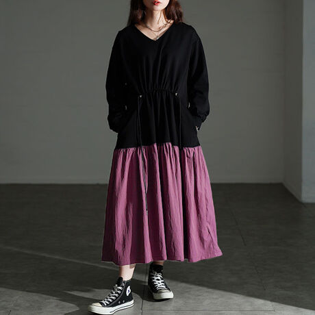 シックなブラックとの配色のコントラストが引き立つ、異素材ドッキングワンピース。シンプルながらも、細部まで拘りを詰め込んだ、大人の遊び心が垣間見えるデザイン。カジュアルながらも、品のある生地を使用することで高見え感も纏う、大人カジュアルを完成。ゆったりとした身頃でリラクシーながらも、フロントのウエスト部分のスピンドルを絞れば、メリハリのあるシルエットに。好みによってシルエットを調整でき、切替部分のギャザーがスカートを程よくふんわりと仕上げ、全身丸ごと体型カバー。モタつきのない丈感ですっきり。