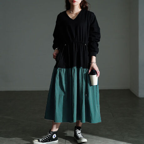 シックなブラックとの配色のコントラストが引き立つ、異素材ドッキングワンピース。シンプルながらも、細部まで拘りを詰め込んだ、大人の遊び心が垣間見えるデザイン。カジュアルながらも、品のある生地を使用することで高見え感も纏う、大人カジュアルを完成。ゆったりとした身頃でリラクシーながらも、フロントのウエスト部分のスピンドルを絞れば、メリハリのあるシルエットに。好みによってシルエットを調整でき、切替部分のギャザーがスカートを程よくふんわりと仕上げ、全身丸ごと体型カバー。モタつきのない丈感ですっきり。