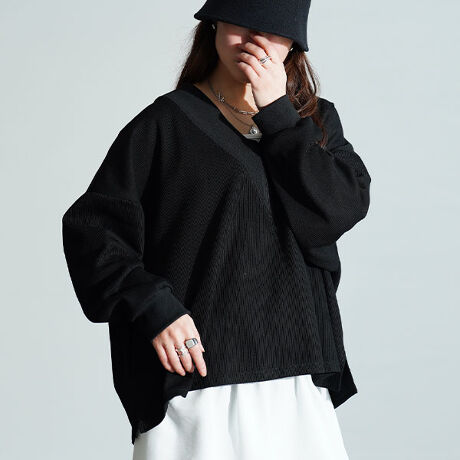 ざっくりとしたVネックがアクセントになった、ベーシックなニットソープルオーバー。立体的な畔編みニットのように見えるサカリバニットソーを使用することで、表情を豊かにし、シンプルながらもこなれ感漂う印象に。綺麗めスタイルにも馴染む着回し力の高さも魅力。ワイドなバスト設定とドロップショルダーでボディラインを拾わず、着るだけで体型カバーに。深めのVネックが顔周りをすっきりとさせ、美しいデコルテラインを描き、大人っぽさをプラス。裾の両サイドにスリット入りだから、フロントをタックインしたスタイリングもサマ見えします。