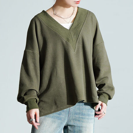 ざっくりとしたVネックがアクセントになった、ベーシックなニットソープルオーバー。立体的な畔編みニットのように見えるサカリバニットソーを使用することで、表情を豊かにし、シンプルながらもこなれ感漂う印象に。綺麗めスタイルにも馴染む着回し力の高さも魅力。ワイドなバスト設定とドロップショルダーでボディラインを拾わず、着るだけで体型カバーに。深めのVネックが顔周りをすっきりとさせ、美しいデコルテラインを描き、大人っぽさをプラス。裾の両サイドにスリット入りだから、フロントをタックインしたスタイリングもサマ見えします。