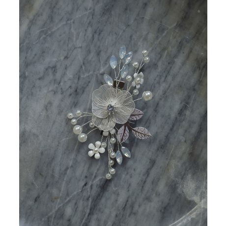立体感があるメタルフラワーを中心にパールやクリアビーズ、軽やかなリーフモチーフを組み合わせた上品なヘアクリップ。