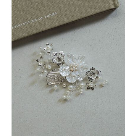 光を柔らかく反射するマザーオブパール調の大ぶりフラワーを中心に、繊細なメタルフラワーとパールを散りばめた華やかなヘアクリップ。