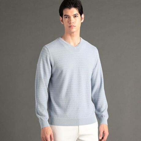 バーチカルシェブロン柄がスタイルアップ効果を持たらし、スマートな印象を演出。