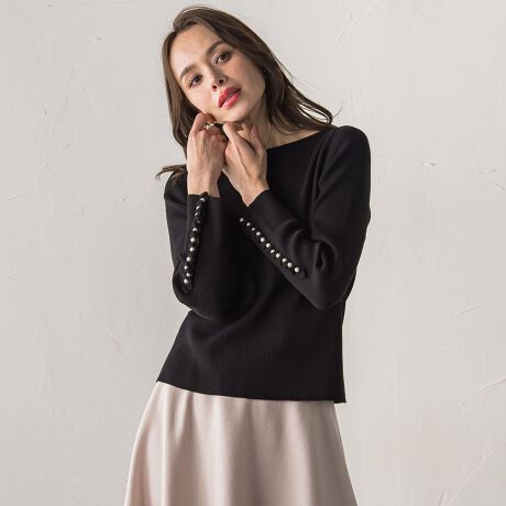 袖口にフリルとパールをあしらった、上品でエレガントなリブニット。