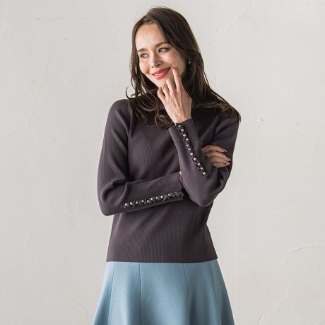 袖口にフリルとパールをあしらった、上品でエレガントなリブニット。