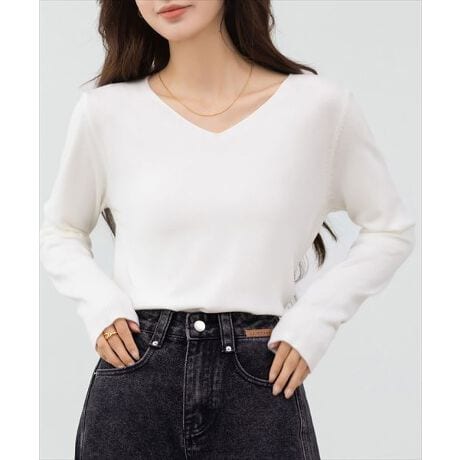 広めのVネックで顔周りすっきりなシンプルニット。