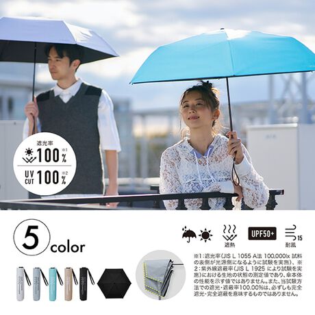 ・遮光率100%、紫外線遮蔽率100%、UPF50+、遮熱効果の晴雨兼用タイプ
