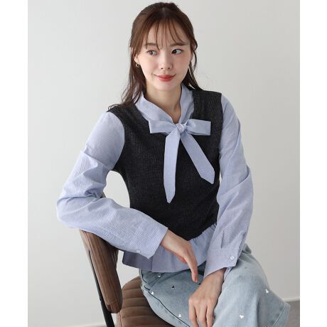 リブ編みのベストにストライプのボウタイシャツをドッキングしたトレンド感のあるトップス。