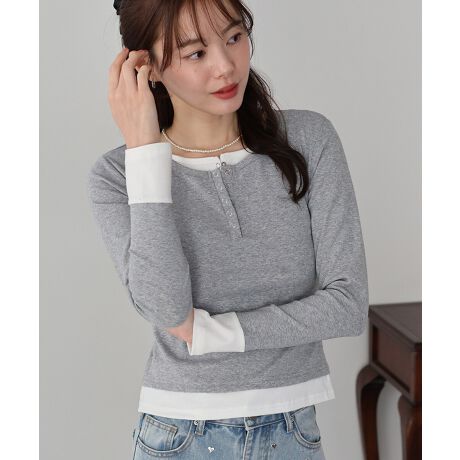 女性らしさと程よいカジュアル感を両立した、レイヤードデザインのヘンリーネックTシャツ