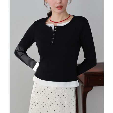 女性らしさと程よいカジュアル感を両立した、レイヤードデザインのヘンリーネックTシャツ
