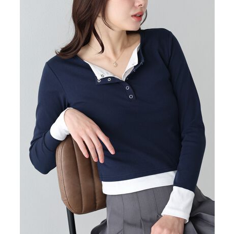 女性らしさと程よいカジュアル感を両立した、レイヤードデザインのヘンリーネックTシャツ