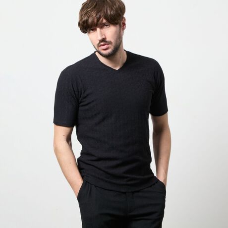 オリジナル幾何学柄ジャカード生地を使用した浅めのVネックプルオーバーになります。