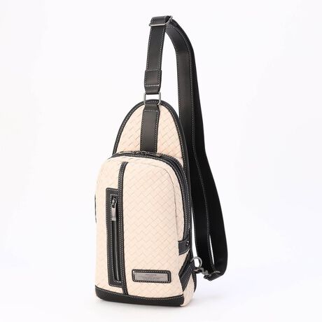 本体部分にツヤ感のある合成皮革をメッシュ調に編み込んだ、高級感溢れるボディバッグ。