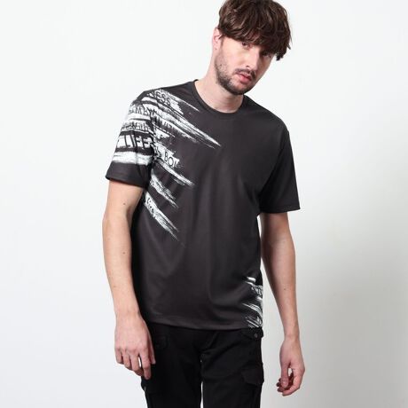 ポンチ素材にバイヤスハケメ×ロゴ柄を昇華転写でプリントした一際目を惹く、クルーネック半袖プルオーバーになります。