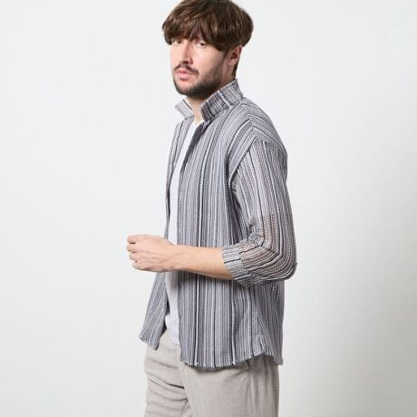 衿を立ててイタリアンカラーの様にも、寝かせてオープンカラーの様にも着用出来るようにしたスタンドオープンカラーデザインの7分袖デザイン。