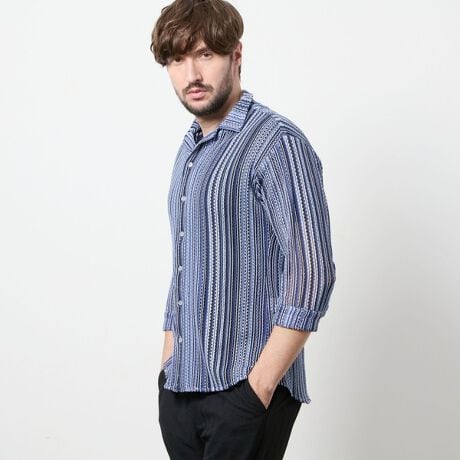 衿を立ててイタリアンカラーの様にも、寝かせてオープンカラーの様にも着用出来るようにしたスタンドオープンカラーデザインの7分袖デザイン。
