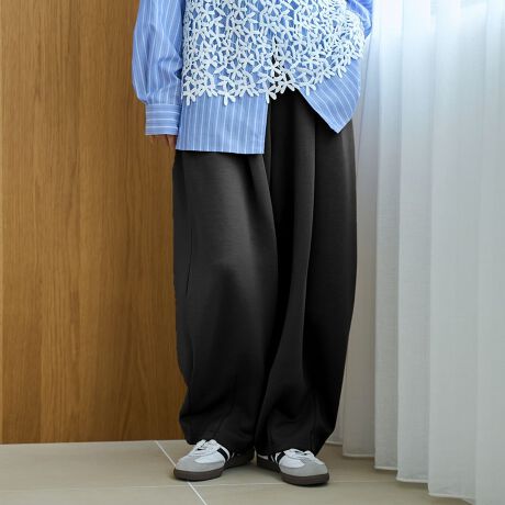 ゆったりとしたワイドなつくりながら、裾にかけて緩やかに細くなるラインで、旬なシルエットを演出します。