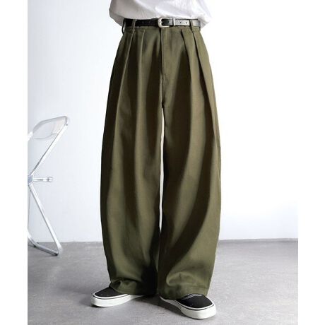 深めのタックにより、独特なバルーンシルエットが特徴で、街中でも目を惹く存在感を発揮。