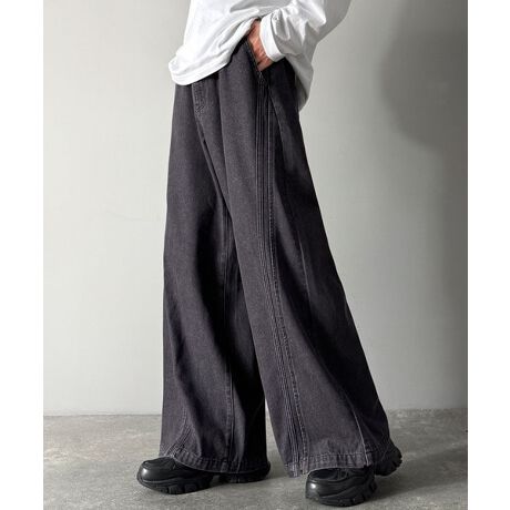 サイドに施されたダブルカーブラインが特徴のデニムパンツ。シンプルながら立体的なシルエットを演出し、リラックス感と洗練さを両立。
