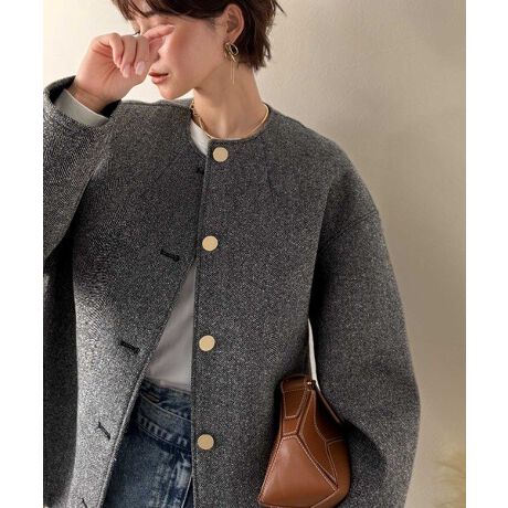 襟のないすっきりとした首元で、マフラーやアクセサリーなど小物使いが映えるノーカラージャケット。