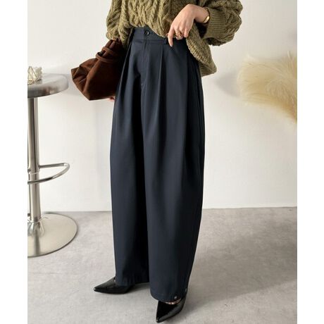 サイドの深いタックが縦の陰影をつくり、腰まわりはすっきり全体はたっぷりとしたシルエットで体形カバーを叶えます。