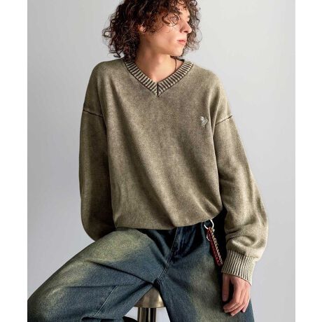 綿100%刺繍入りピグメント加工Vネックセーター」