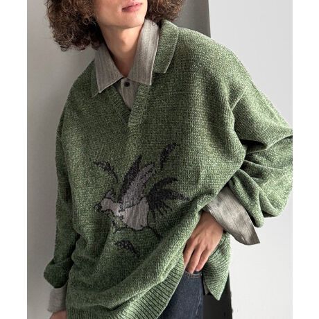 モール糸使いルースター柄襟付きVネックセーター」
