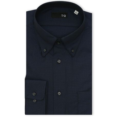 モードな雰囲気が漂うドビーの織り柄です。衿型は衿開きが大きく、ネクタイとのバランスが取りやすいワイドカラーを採用しています。すっきりとした印象の裏前立て、衿腰内側とカフス裏の別生地、角落ち型のカフスとパイピングがポイントになっています。