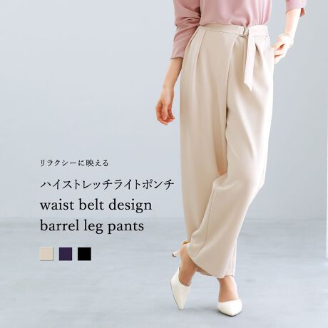 ハイストレッチライトポンチ・ウエストベルトデザインバレルレッグパンツ